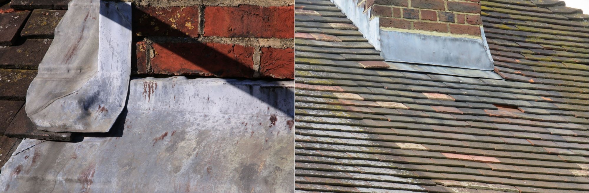Left to right: Lead flashing around the chimney and loose tiles, Lead flashing or metal strips coming loose at chimney area.